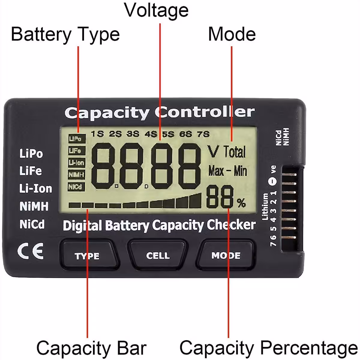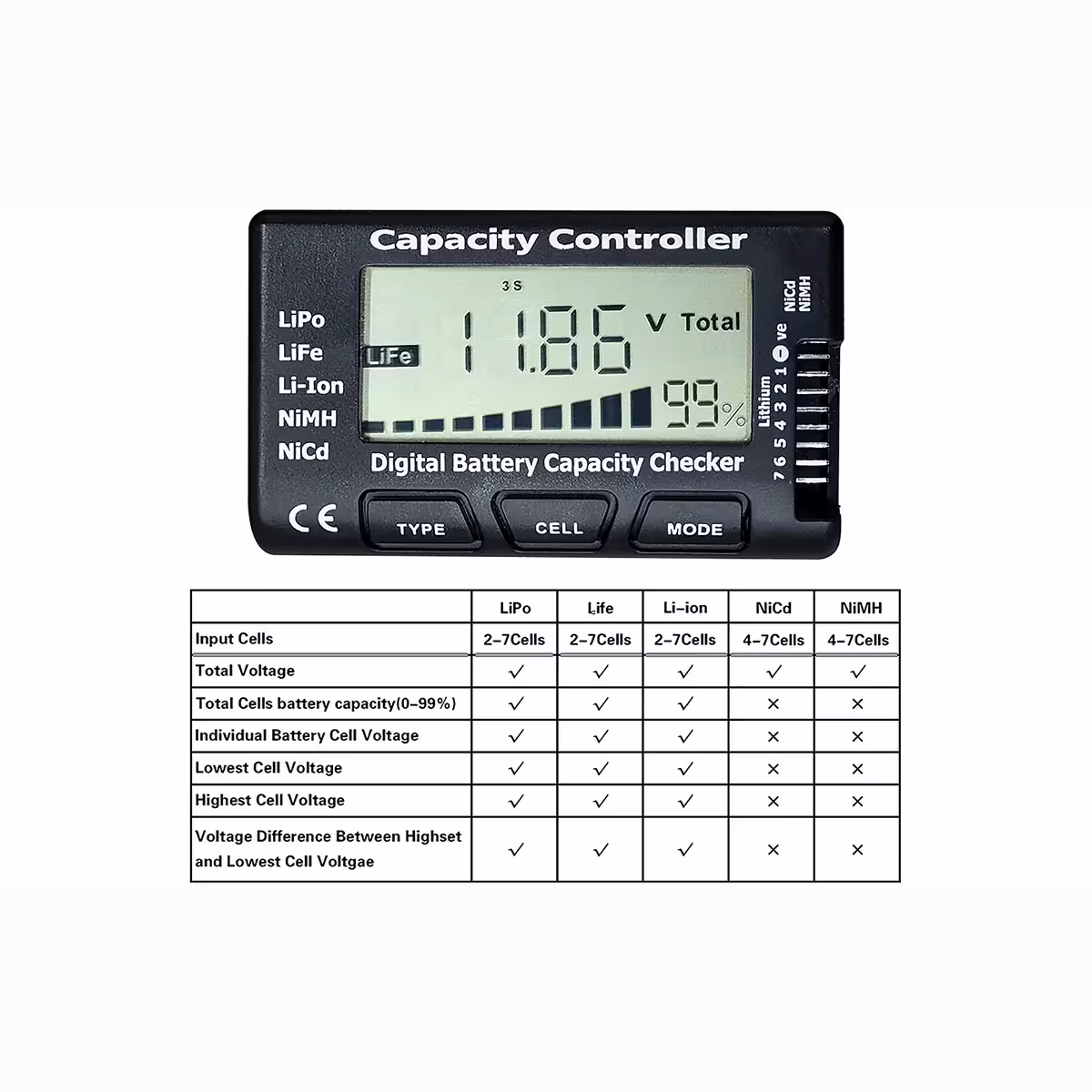 Αυτός ο tester χωρητικότητας μπαταριών Li-Ion, LiPo, LiFe, NiMH και NiCd είναι συμβατός με συσσωρευτές 2-7S και προσφέρει ακριβείς μετρήσεις τάσης και της υπολειπόμενης χωρητικότητας. Ιδανικός για λάτρεις RC, τεχνικούς ή χρήστες που θέλουν να παρακολουθούν την κατάσταση των μπαταριών με μέγιστη ακρίβεια.