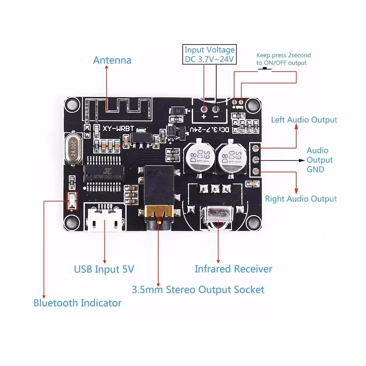 XY-WRBT είναι μια σύγχρονη μονάδα αποκωδικοποιητή ήχου Bluetooth, εξοπλισμένη με συμπεριλαμβανόμενο τηλεχειριστήριο για πλήρη απομακρυσμένο έλεγχο. Ιδανική για ενσωμάτωση σε DIY έργα, αυτός ο δέκτης ήχου προσφέρει σταθερή σύνδεση και στερεοφωνική αναπαραγωγή υψηλής ποιότητας.