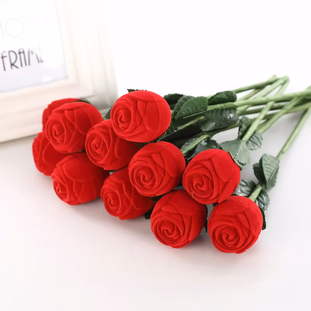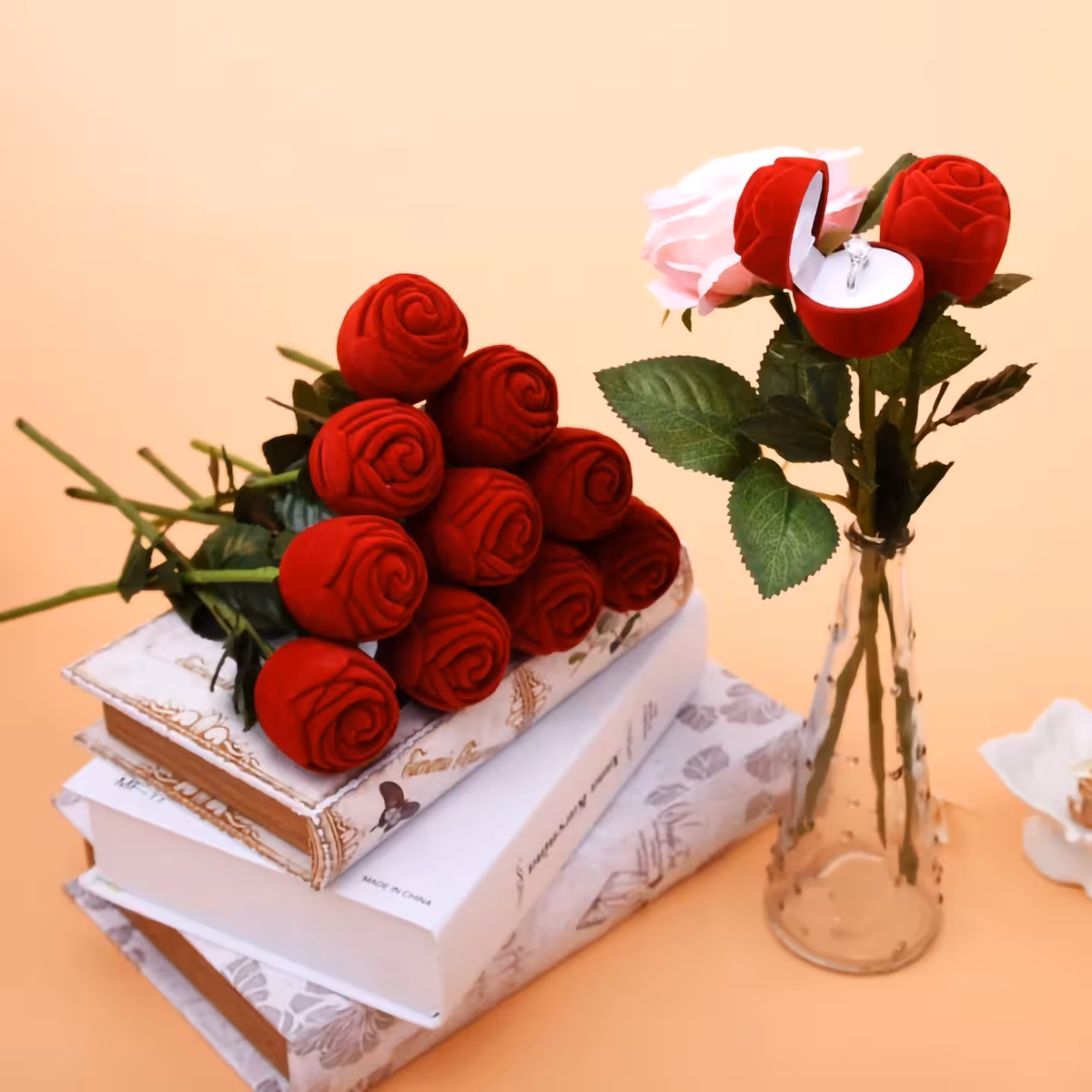 Κομψό βελούδινο κουτί σε σχήμα τριαντάφυλλου, ιδανικό για δαχτυλίδι αρραβώνων, σκουλαρίκια ή κρεμαστό. Ρομαντικός σχεδιασμός, τέλειο για προτάσεις γάμου ή ειδικά δώρα.