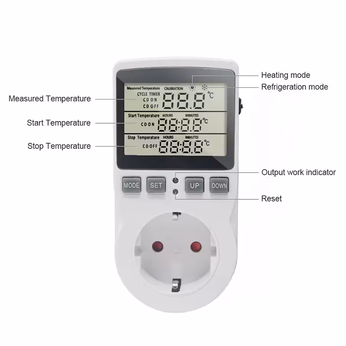 Ψηφιακή πρίζα με θερμοστάτη, ιδανική για ακριβή διαχείριση της θερμοκρασίας σε οικίες και επαγγελματικούς χώρους. Συμβατή με ηλεκτρικά καλοριφέρ, θερμαντικά σώματα, κλιματιστικά, ανεμιστήρες, θερμοκήπια, ενυδρεία και άλλες συσκευές που απαιτούν αυτόματο έλεγχο θερμοκρασίας.