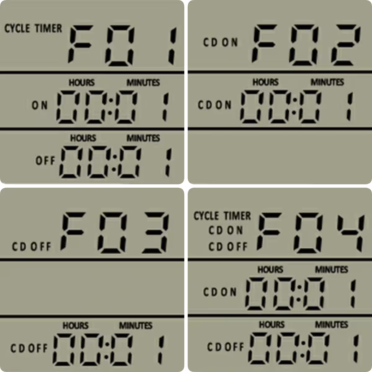 - F01: λειτουργία χρονισμού – λειτουργεί μόνο όταν είναι ON, επαναλαμβάνει τον κύκλο.