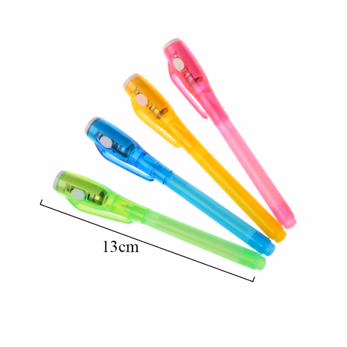 Κάθε στυλό διαθέτει LED UV φως στην άκρη, ώστε να μπορείτε να ελέγχετε άμεσα τα γραμμένα μηνύματα. Ιδανικό για παιδιά, νέους και δημιουργικές δραστηριότητες στο σπίτι, στο σχολείο ή σε θεματικά πάρτι.