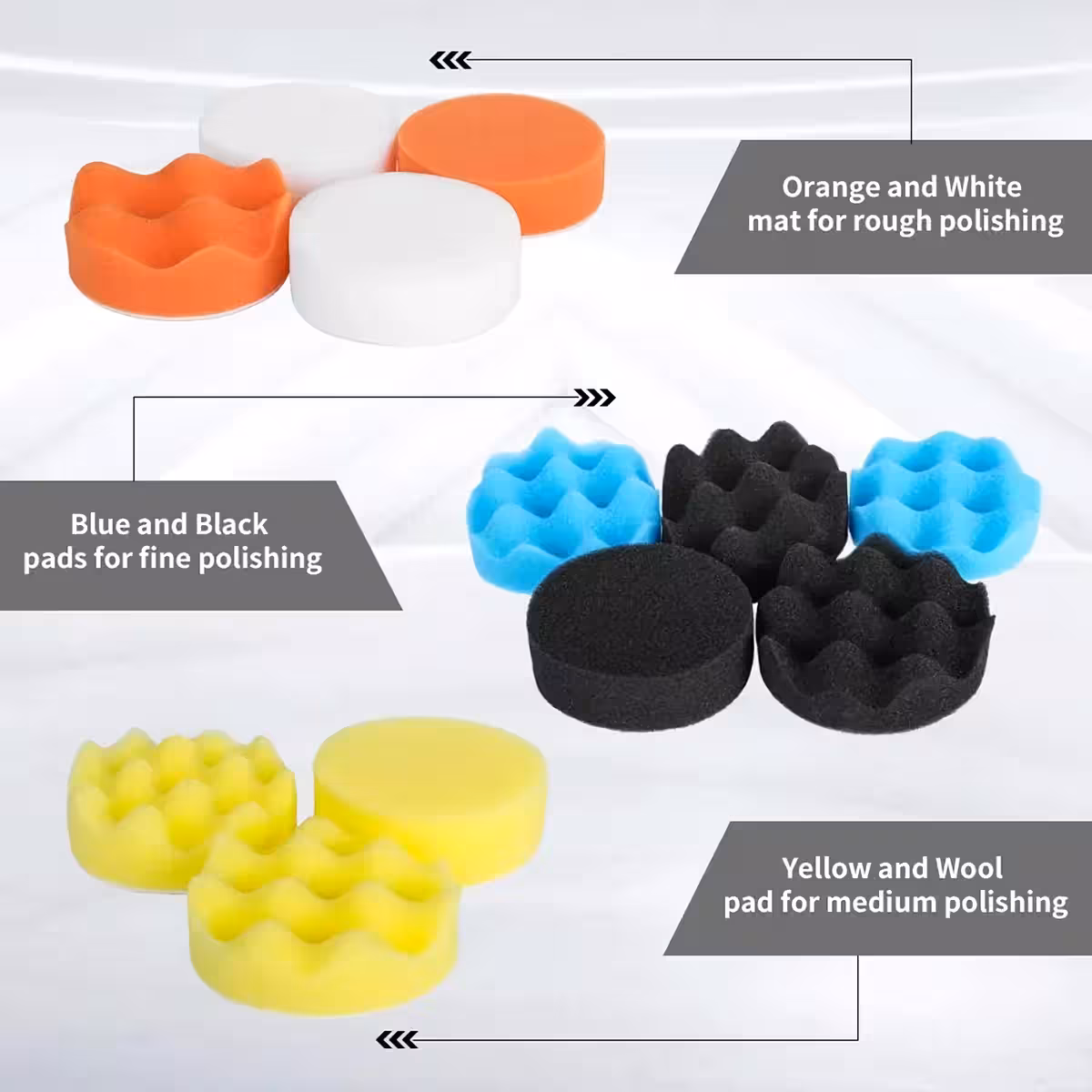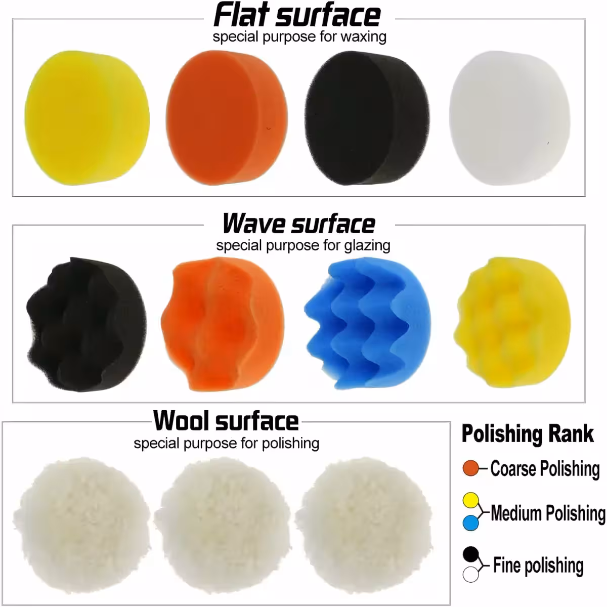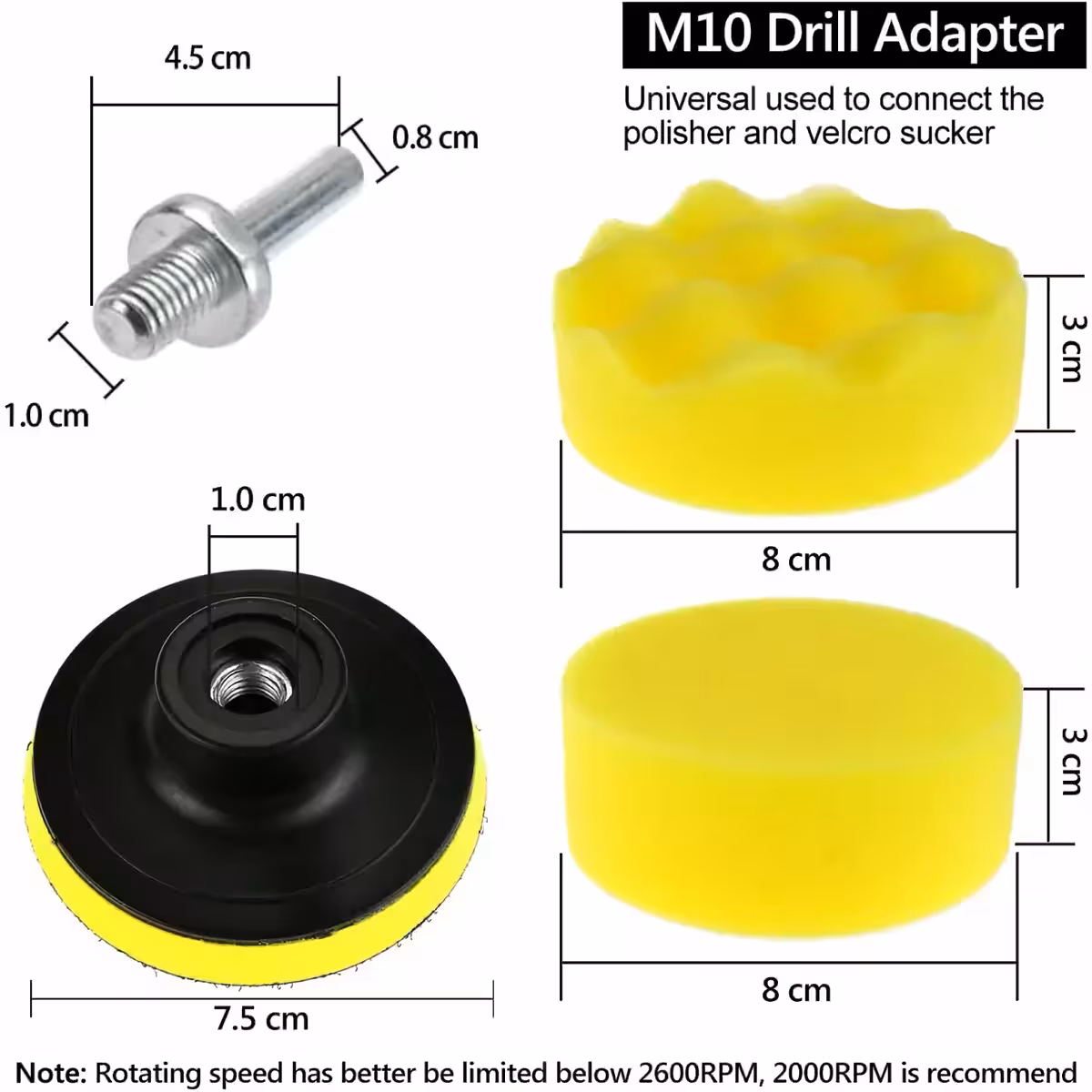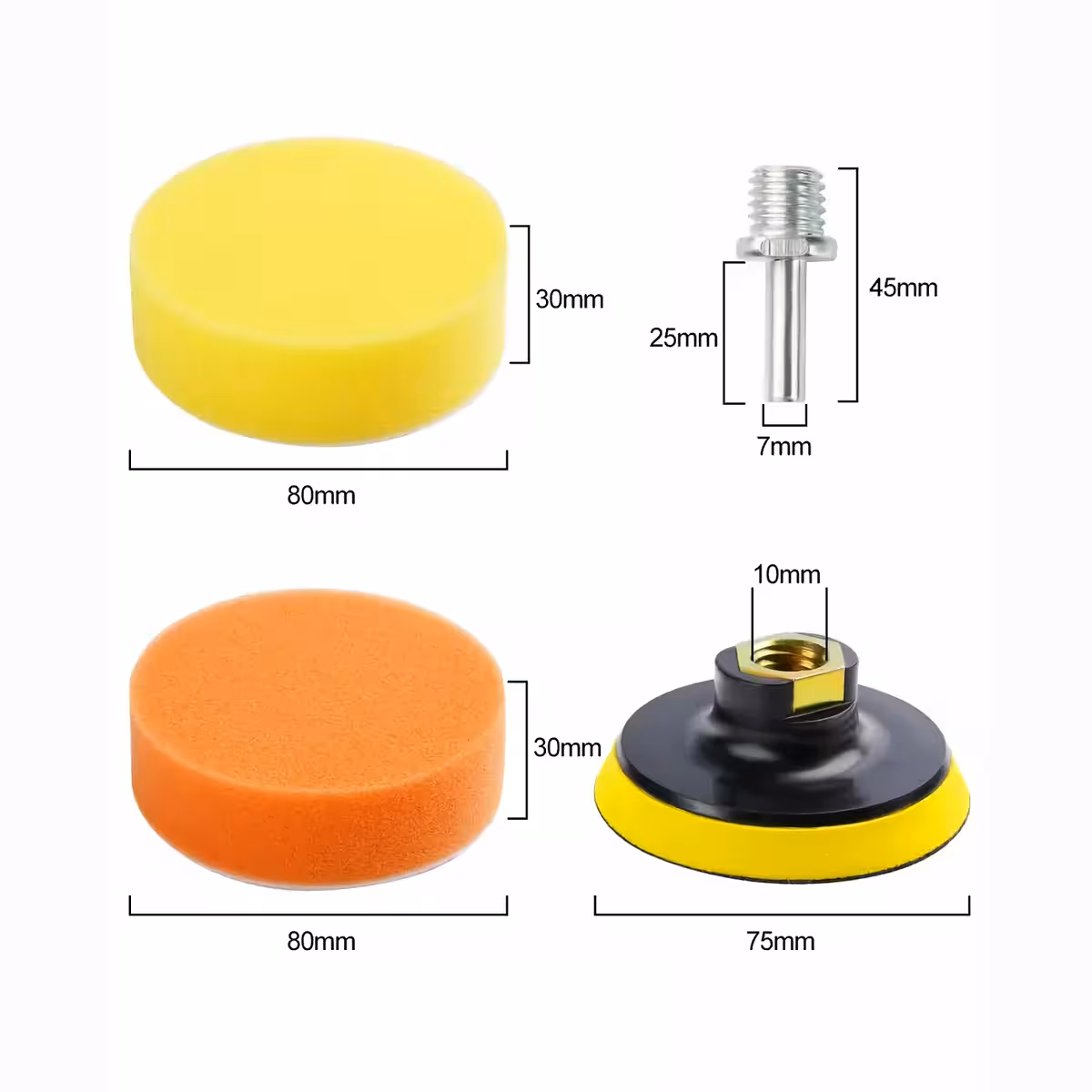 Αυτό το πλήρες σετ σφουγγαριών και δίσκων polish αυτοκινήτου έχει σχεδιαστεί για γυάλισμα και συντήρηση βαμμένων επιφανειών, όπως αμάξωμα αυτοκινήτου, πλαστικά, μέταλλα ή γυαλί. Μπορεί να χρησιμοποιηθεί με οποιοδήποτε τρυπάνι ή μηχανή γυαλίσματος, χάρη στους 3 συμπεριλαμβανόμενους αντάπτορες.